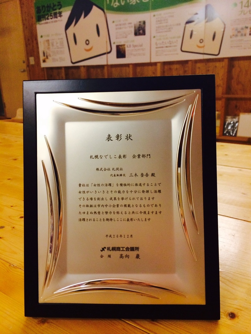 札幌商工会議所が今年第一回目として行った「札幌なでしこ表彰」の選考に、 企業部門3社中の1社として弊社が選ばれました。